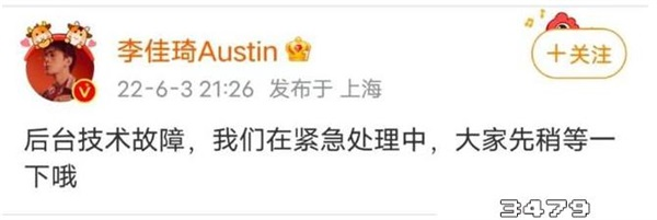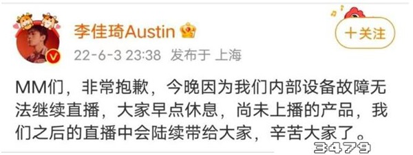 6月3日,李佳琦在直播间还没结束的时候,直播被中断了。直播被中断之后,李佳琦便在微博发了一条信息“因后台技术故障,需暂停直播”。随后,李佳琦又发布了一条微博信息说到“由于设备故障没有办法继续进行直播,对没有上播的商品会在后面的直播中陆续上播”。但是,到了6月18日,李佳琦停播了十几天也都还未重新开直播。