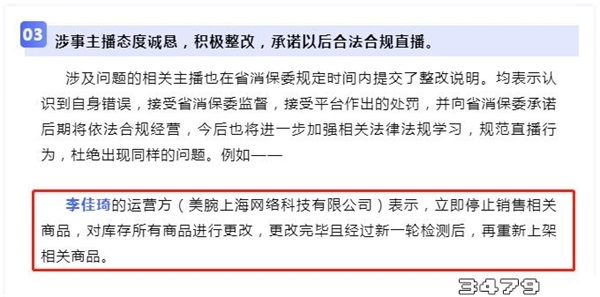 李佳琦的运营方(美腕上海网络科技有限公司)表示,立即停止销售相关商品,对库存所有商品进行更改,更改完毕且经过新一轮检测后,再重新上架相关商品。