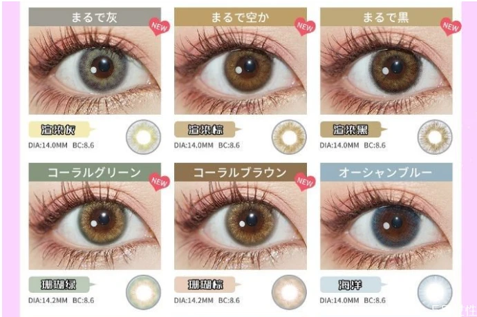 最后给大家看一些好的品牌的色板图,排版整齐,不但会有美瞳照片及眼部图,还会标注出相关参数,一目了然!