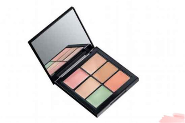 六色遮瑕膏,顾名思义,就是有六种颜色。其中,紫色用来调和肤色遮暗黄部位;黄色适合涂在眼下提亮遮眼袋;浅米色可以适用于各种皮肤问题及提亮肤色;栗色可以用来修容打造阴影。这些都是用量比较小的。六色遮瑕膏中的绿色和粉色用的比较多。绿色用来中和泛红的皮肤及红肿的痘痘痘印,红肿的暗疮是最难遮盖的,再专业的化妆师在这个环节上也都会特别小心。偏绿色调的产品被证实是遮盖暗疮最有效的;粉色遮眼下发青黑眼圈效果很好。将遮瑕膏点在黑眼圈位置,用无名指轻轻将遮瑕膏向四周推匀。再用海绵将日用粉底液均匀涂抹全脸,到眼圈位置时不要推抹,而用轻按的方式抹匀。遮盖黑眼圈的时候,千万不要忘记内眼角及外眼角,因为这两个部位是黑眼圈最严重的地方,同时却也是最容易被忽略的地方。