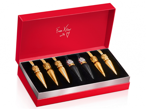 它的外观造型也并不像是传统的口红以圆柱形作为口红的管身,而是参照红底鞋鞋跟的设计呈现尖锥形,就像是“萝卜丁”的形状作为口红的管身,并且它的口红盖的设计也是十分的特别,它的口红盖犹如城堡塔的楼顶,它的整个外壳造型极富视觉冲击力。
