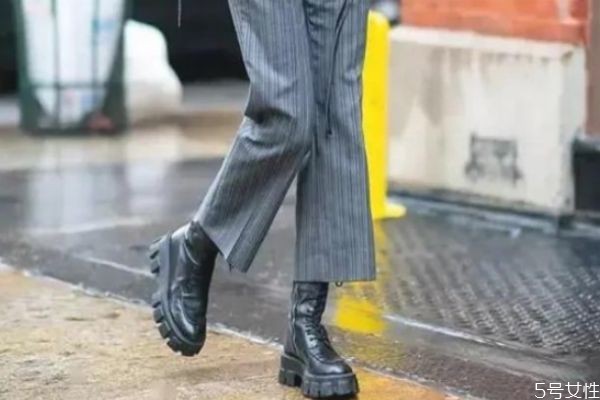 马丁靴搭配裤装的时候尽量选九分的长度,避免裤子在鞋口那里堆起来,这样会显得比较利落。