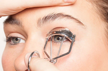 然后,将睫毛夹上面的口子对准睫毛根部,一定要保证所有睫毛都穿过了这个口子,直立地面握着睫毛夹。关闭睫毛夹,稍用劲挤压并且保持几秒钟,不要眨眼睛。