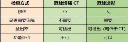 根据解剖研究的结果,心肌桥的检出率为33%~42%。目前常用的检查方法是冠状动脉增强CT。前面提到的李先生和张先生就是通过这项检查被确诊的。另一种方法是冠脉造影。相比较而言,增强CT具有创伤小、更便捷的优点,检出率也略高;但冠脉造影还能检测心肌桥的功能,可以帮助医生对病情充分评估。二者利弊参见下表。