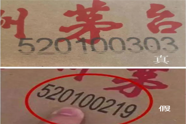 1、通过外箱编号分辨真假:正品的茅台酒外箱的编码是经过喷码机喷涂上的,数字会存在一定的断裂,同时正品茅台酒的logo非常清晰且颜色均匀;假的整箱茅台酒的编码是连续的,不存在断裂的情况,假的茅台酒logo是模糊不清的,颜色也存在深深浅浅的情况。