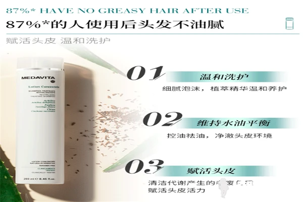 用这个MEDAVITA洗发水后效果真的惊艳到了。淡淡的草本香味闻着很舒适,洗完头发后感觉整个头皮都有种通透的清爽感,可以帮助温和的去除头皮屑。旋转瓶身很温和的洗发水,可以直接涂抹在头皮,按摩后冲洗干净,头皮一点都不紧绷,头发也不毛躁。有时候本人还会搭配同系列菁华赋活精华液护理头皮,头皮保养好了秀发自然来。