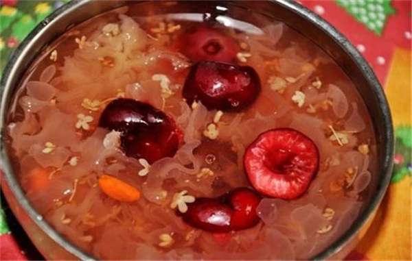 樱桃、银耳、冰糖,各适量,先把银耳用泡软泡发后清理干净,樱桃洗净去核。先在锅中加水和银耳煮半小时,然后放入冰糖煮开,再加樱桃,继续煮一会即可,有补气养血,美容祛斑的作用,另外还可白嫩肌肤,让皮肤更有光泽。