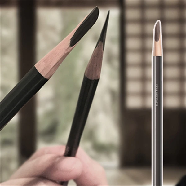 第二步:用美工刀从刚才做的记号处往笔尖处削皮,左手握住眉笔,右手大拇指搭在美工刀上,朝笔尖方向贴着笔稍微抬一点点平平的削下去。削完一面后就把笔旋转180°削另一边。