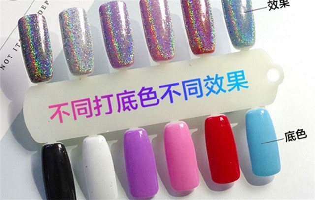 关于使用方法,可以把镭射粉直接散在未干的甲油底色上,也可以把它和指甲油混合后使用;可以用镭射粉做渐变效果,也可以用它做各种彩绘。总之,方法是多种多样的,只能能想得到就可以去尝试。