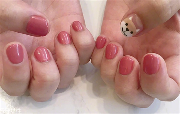 豆沙红色美甲作为主色调,如果单单只是豆沙红的单色美甲难免会觉得成熟职场。所以这里搭配卡通狐狸,是不是变得可爱很多呢。
