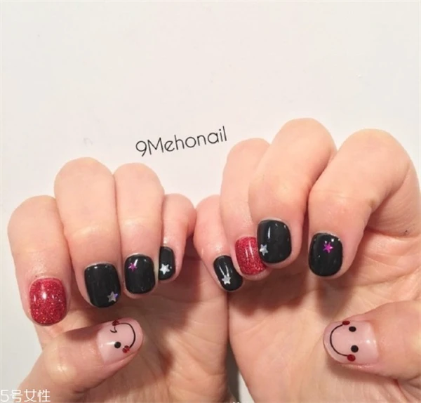 这一款黑色为主的韩式美甲也很惹人喜欢,在笑脸和星星的搭配之后,整个款式立马变得可爱风,很俏皮可爱。