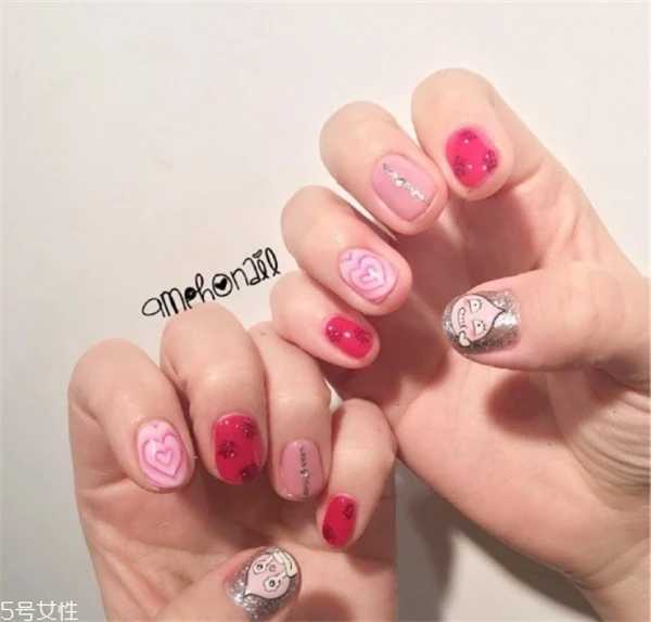 非常可爱的一款韩式美甲,比较适合20左右的年轻妹子选择。粉色和红色为主,颜色明亮又显手白,加一点小心机设计,整款美甲就不一样。