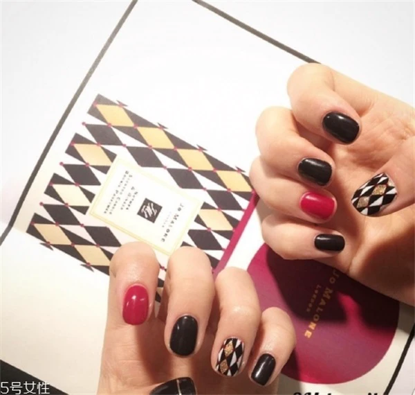 这绝对是一款时尚与大气兼并的韩式美甲,黑色为主色调,相当有时尚大牌感,再涂一点红色来调节,有一种画龙点睛的效果。