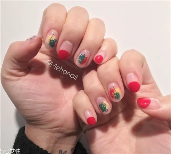 韩风美甲主打小清新,这一款美甲就非常清新好看。采用半涂红色+跳色设计,不仅有设计感更能彰显小女生的可爱气质。