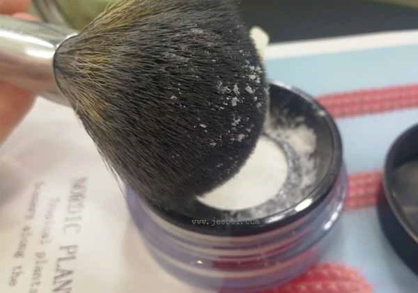 用蜜粉前,我先用了隔离和素颜霜做了一个打底,再用蜜粉刷扫蜜粉上脸。蜜粉不能直接用手或海绵球拍上脸,这样不仅浪费蜜粉还会全部渗透到海绵球里面去了。由于我用的素颜霜是滋润型,所以涂上脸后会有一点油腻的感觉,所以必须再涂一层蜜粉后面的眼妆腮红那些才好画。能明显看到没上蜜粉的那一边脸是有反光的,上了蜜粉那一边皮肤比较平整光滑,也变得细腻了。