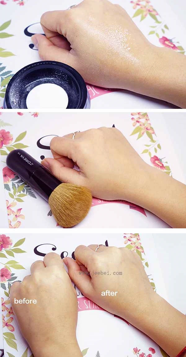 散粉颜色看起来是白色的,但涂在脸上是透明无色的,没有遮瑕效果,也不泛白,几乎也没有什么味道。我在手背上涂了一些橄榄油,用蜜粉去覆盖,发现原本油油的手背变得光滑起来,没有油腻感,很清爽,很适合夏天使用。而这款蜜粉没有太大的遮瑕力度,也不是那种能让皮肤变白的蜜粉,两只手做对比能看出没什么颜色差别。