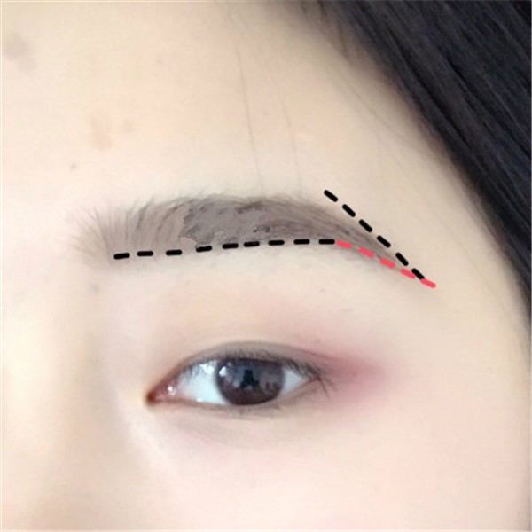 如下图,第一步化一条底边线,微微向上倾斜得。如果你喜欢平眉,就直接化到底,如果你喜欢我这样的眉毛,就画到眉峰下面。
