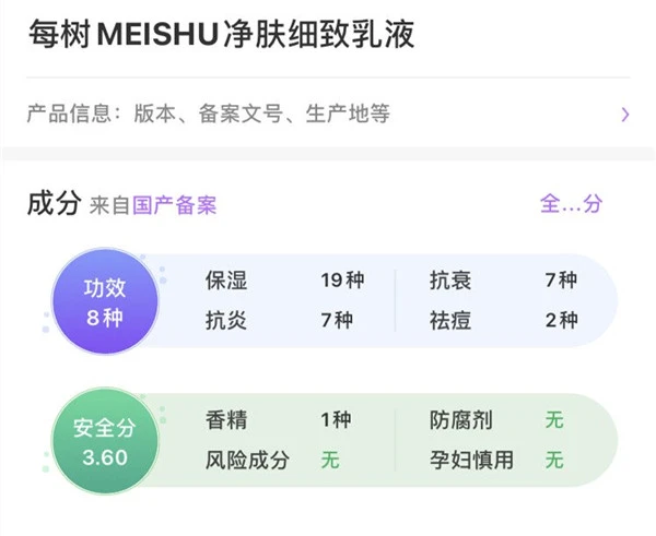 而关于它的效果怎么样,我们拿它的每树MEISHU净肤细致乳液举例,它的证书编号是“京G妆网备字2021000948”,小编在美丽修行APP上查询它的成分信息,有保湿、抗衰老、抗炎以及祛痘的作用,安全性也是比较高的,没有任何风险成分以及防腐剂,只不过添加了一种香精。