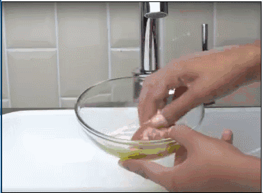把美妆蛋浸湿,再用适量的洗液揉搓按压。