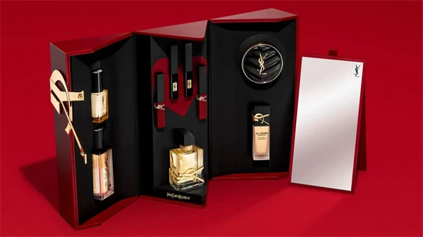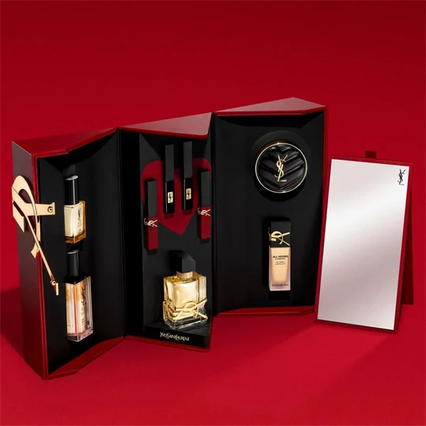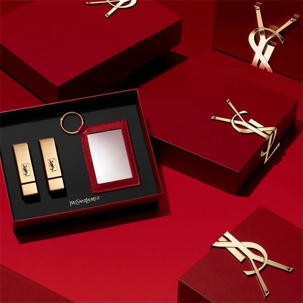 2022年七夕,YSL BEAUTY以奢华缎面丝绒唇膏为灵感,打造限量极速追爱礼盒包装,无人能抗拒的红色皮革为包装,将挚爱的经典美妆礼盒狂美到新境界,手指抚过金色YSL CASSANDRE LOGO,打开红色皮革般的礼盒,呈现在黑色衬垫上的梦幻逸品包含奢华缎面丝绒唇膏、恒久完美无瑕持妆粉底、恒久完美雾光气垫粉饼、极效活萃夜光仙人掌超级精华或是自由不羁香水系列,将YSL最经典畅销的商品集结其中,在礼盒内附有收纳空间以及立体化妆镜,让澎湃汹涌的爱更完整表现。