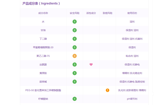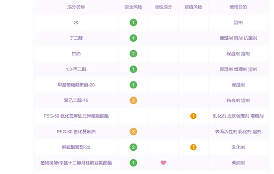 有水、丁二醇、甘油、1,3-丙二醇、甲基葡糖醇聚醚-20、聚乙二醇-75、PEG-50 氢化蓖麻油三异硬脂酸酯、PEG-60 氢化蓖麻油、鲸蜡醇聚醚-20、植物甾醇/辛基十二醇月桂酰谷氨酸酯等成分。