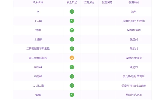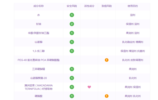 有水、甘油、辛酸/癸酸甘油三酯、山嵛醇、1,2-戊二醇、PEG-40 氢化蓖麻油 PCA 异硬脂酸酯、三异硬脂精、山嵛醇聚醚-20、澳洲坚果(MACADAMIA TERNIFOLIA)籽提取物、硬脂酸等成分。