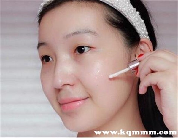 3、精华液:取适量的精华液,分别点涂在额头、鼻子、两颊、下巴等皮肤易干燥的部位,用手以打圈圈的方式将精华液均匀的涂抹开来,用手指轻轻提拉脸部肌肤。