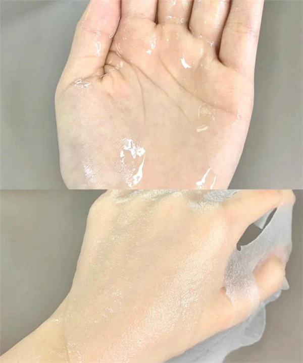 这个面膜材质比较神奇,干的时候普普通通,但一接触精华就会变得像凝胶一样,很柔软服帖,一般安瓶面膜会采用这样的膜布材质,就是比较难贴。