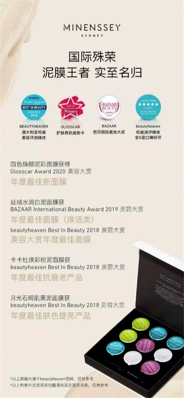 继2018~2020年多次获得澳洲年度最佳面膜权威奖项后,MINENSSEY蔓索明星产品泥膜再次获得澳洲美容个护界最权威的奖项之一—— beautyheaven Best in Beauty Awards 2021年度最佳面膜奖RUNNER UP殊荣!