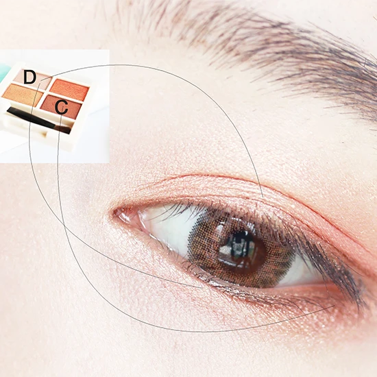 深棕色眼影晕染在下眼尾小三角区,让眼妆更有层次感。珠光香槟色眼影点在上眼皮中央,作为提亮。