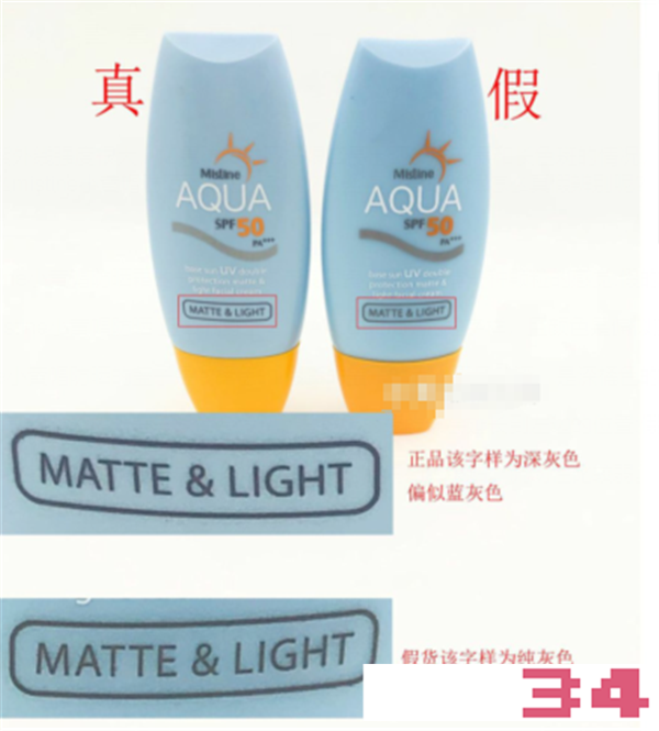 2、根据字体颜色分辨真假:正品的mistine小黄帽防晒 正面瓶身上有“MATTE&LIGHT”的字样,且颜色是偏似蓝灰色的;假的防晒霜瓶身上“MATTE&LIGHT”字体颜色为纯灰色。