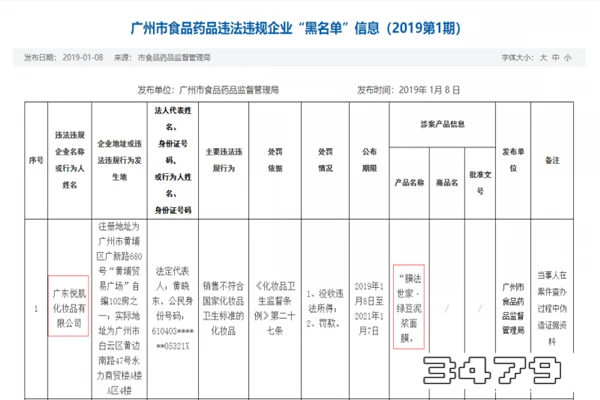 2、最近一次出现在2019年1月份,即在2019年1月8日因销售不合格“膜法世家.绿豆泥面膜”被广州市食品药品监督管理局列入违法违规企业“黑名单”。该公司是将广东悦肌化妆品有限公司。如图所示: