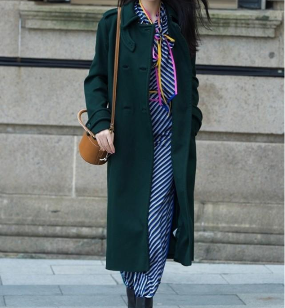 经典的海魂衫,配上白色长裤和墨绿色的风衣,法式风情的演绎,是永不过时的极简装扮。