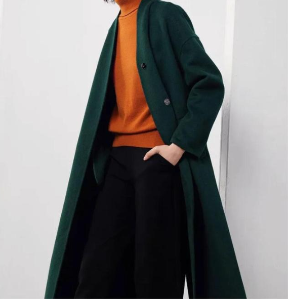 冷暖色系的搭配,杏色的长裤搭上墨绿色的外套,养眼又好看。