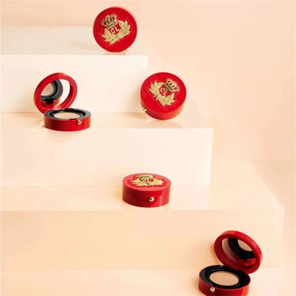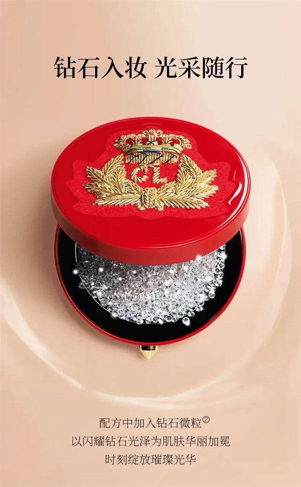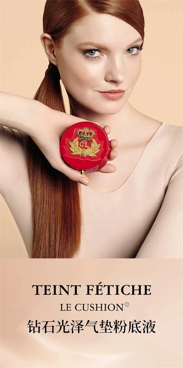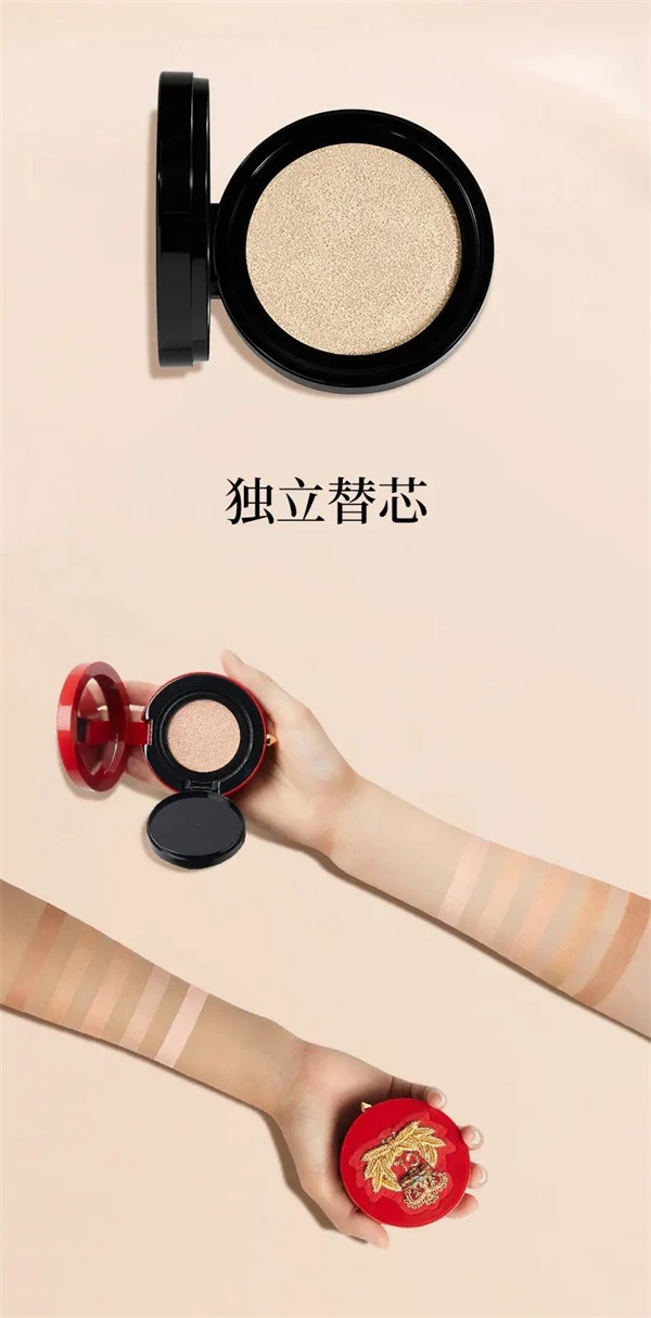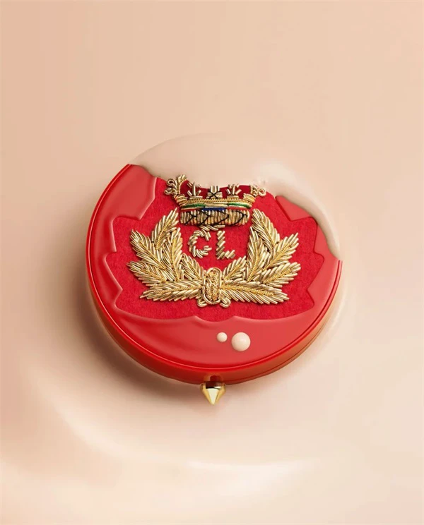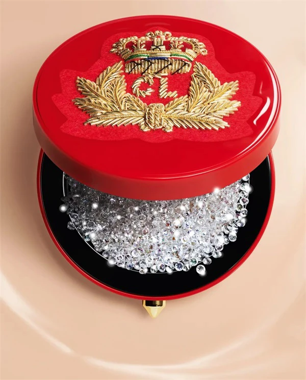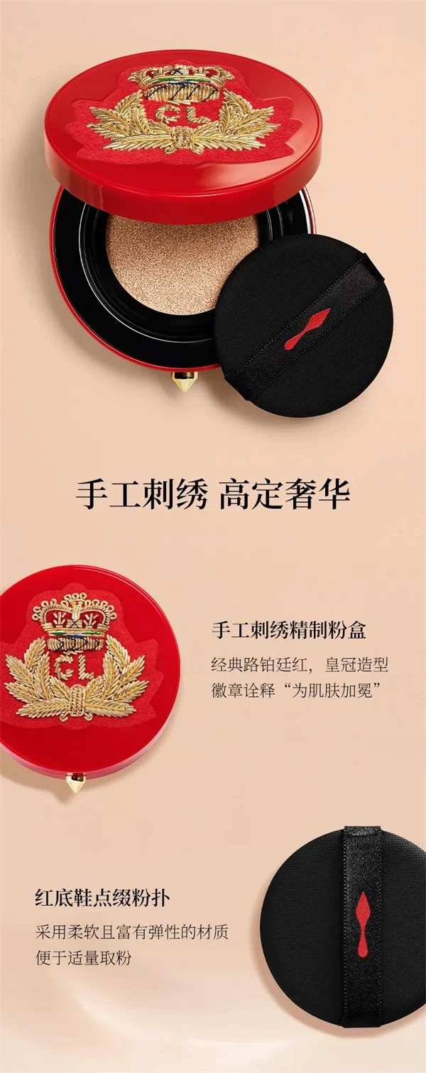 延续品牌呈现艺术品级产品外观的设计理念,钻石光泽气垫粉底液的粉盒,在用色上采用经典路铂廷红,由漆光质地的粉盒配以皇冠造型徽章,诠释了“以钻光为肌肤加冕”。奢华金色丝线由重工手工刺绣制成,每一块气垫本身就是一份特别的艺术杰作。高定气垫粉盒,欧洲匠人手工刺绣,限量生产;路铂廷经典红手包,延续品牌艺术级外观设计,红底鞋造型拉链点缀,如高定时装般耀目奢华。标志性路铂廷红。重工精制,缔造高定皇冠刺绣徽章;红底鞋造型点缀软弹粉扑,取粉适量,精准补妆。随行携带,随形钻光,时刻焕发奢耀女王风范。