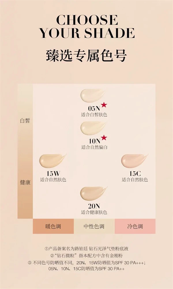 在色调设计上,秉承色彩美学,专为亚洲肤色量身定制。从冷色调、中性色调到暖色调等五种色调,综合考量肌肤色调和肌肤深浅度,适合白皙色、自然色,与健康色肌肤。臻选女王专属色号,打造奢润闪耀的钻石光泽底妆。适合白皙肤色的05N与适合自然偏白的10N中性色调,水润白皙,焕现妈生好皮;适合自然肤色的15C冷色调与15W暖色调,上妆通透自然,轻松打造均匀自然美肌;20N健康肤色中性色调,赋予肌肤舒适阳光妆感。
