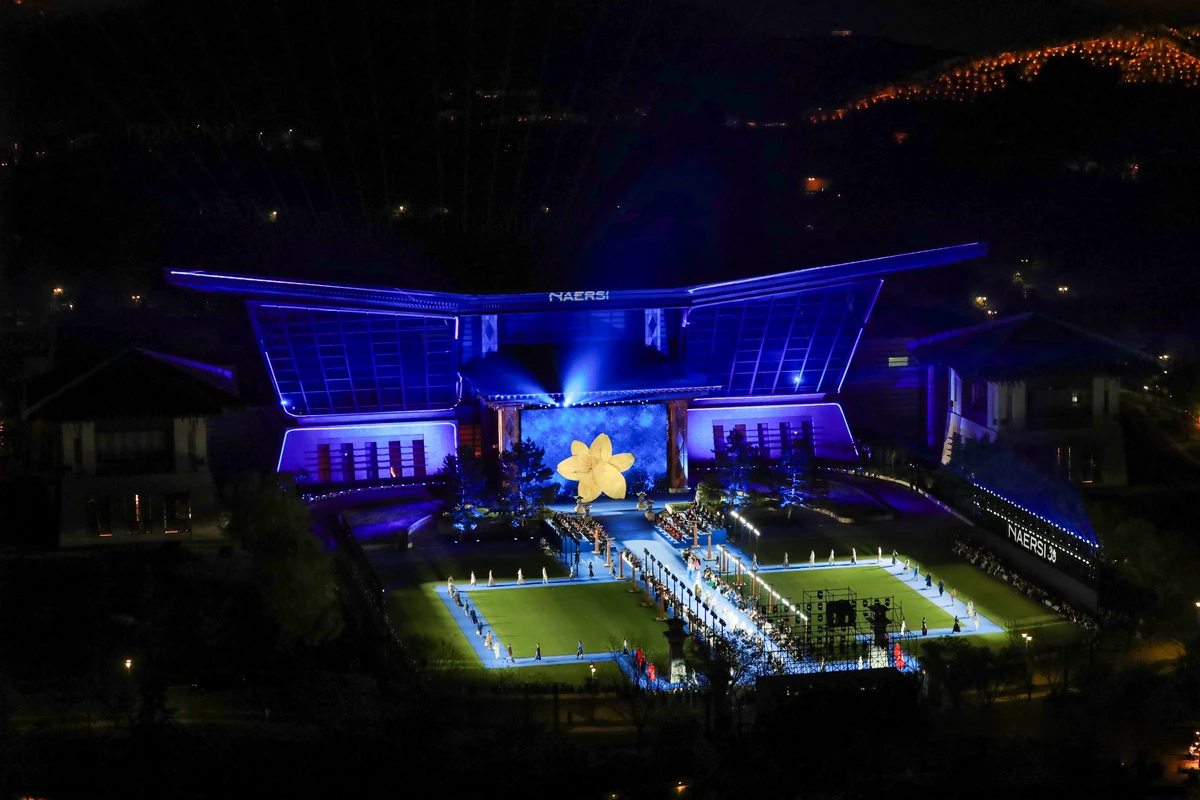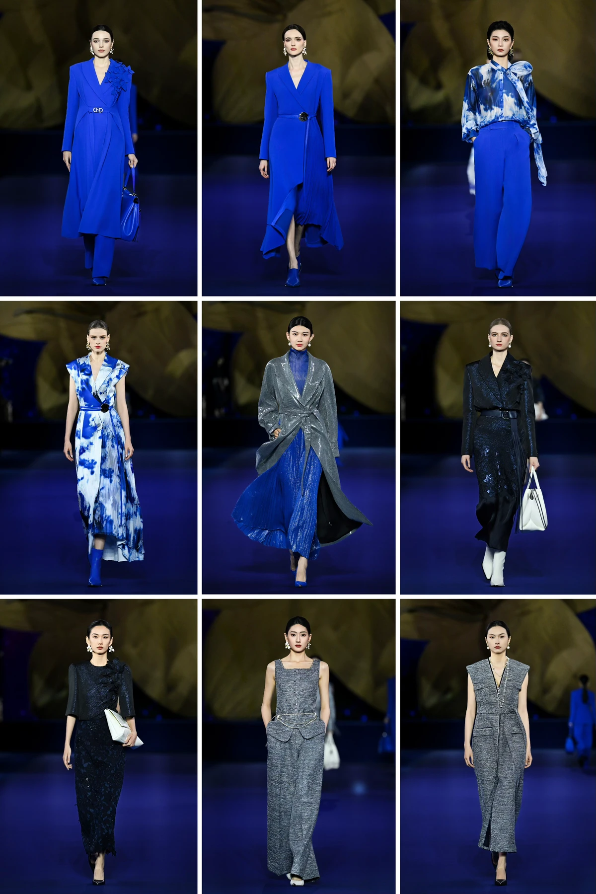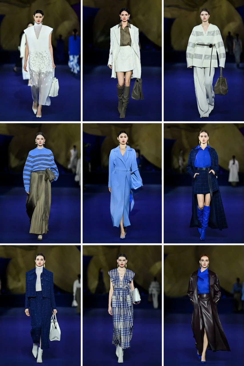 秀场设计以“加冕礼”为核心,选址于世界级峰会的国际会都——北京雁栖湖国际会议中心上演,时尚与自然、人文艺术在此交织加冕盛宴。NAERSI标志性25°蓝渲染夔龙纹迎宾道,象征通往荣耀的加冕之路。秀道中央百合艺术装置匠艺盛绽,为女性献上优雅冠冕。曾创编百余部国际大型音乐会作品的著名作曲家李勋先生受邀作为大秀音乐总监,以交响乐团奏响典雅乐章,与立体光影秀形成视听共振,营造出古典歌剧院般的典雅氛围,模特们身着优雅臻装从容缓步,经典与创新在同一空间碰撞、交融,绽放内蕴女性优雅精神的时装风尚。