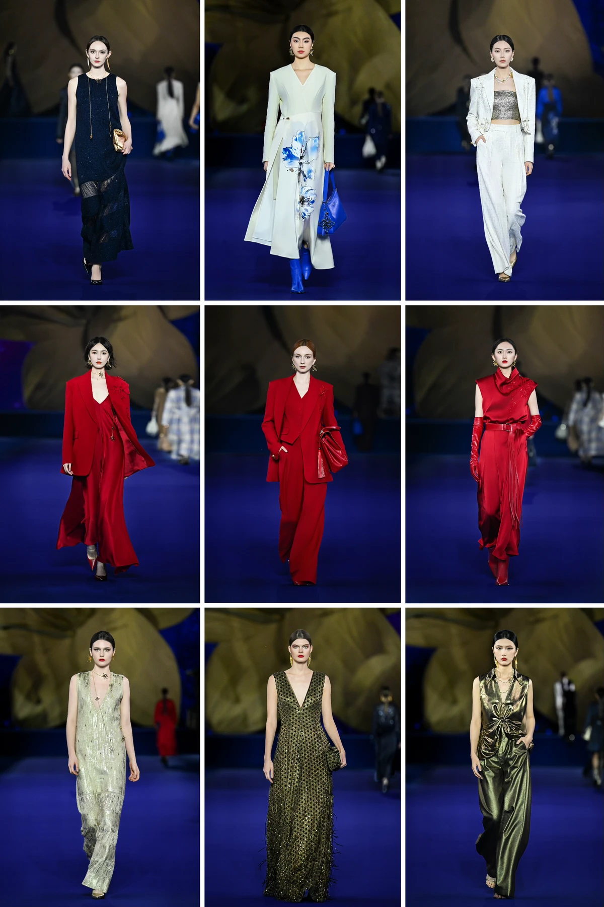 【时间的花】——圣星百合礼赞,致敬经典优雅,祈愿女性永葆本心,自在盛放。25度蓝着染圣星百合,再现品牌经典款、标志性工艺——NAERSI经典款真我套装、花瓣大衣以先锋设计回归、以经典致敬三十载优雅历程;【匠心盛开】——重瓣百合盛开,闲雅新生:以自信之姿,迎接每一次绽放。品牌经典花瓣领、经纬格纹,结合流行元素焕新演绎,线迹描摹女性柔韧并济的自信轮廓,赋予日常雅致逸趣;【赞许花冠】——鎏金百合加冕,华丽优雅:时光鎏金,荣耀嘉奖女性。栩栩如生的定位百合花、手工立体花,绽放于翩雅盛装,复现贵族优雅气质,映升高级时装的奢雅华光;【星耀前路】——宫灯百合熠耀,优雅高定:绽释女性永远向光生长,无龄感的态度,辉映当代女性自主璀璨的人生。高定礼服融蕴优雅工坊标志性柔光装饰,以精致珠钻、星光面料、立体装饰等细致匠艺——凝聚的大美鎏光,辉映女性隽美闪耀“从容、自在”的优雅精神。聚光灯下,质感细节传递臻装背后精准繁复的工艺表达与美学坚持。NAERSI在对过往的不断超越中,迈向充满多元构想的未来。