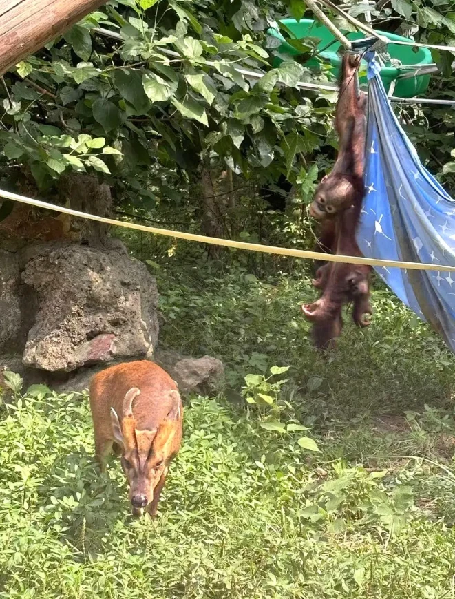 阳光洒在猩猩馆的草地上,猩猩们在高处嬉戏,小麂们在低处觅食......