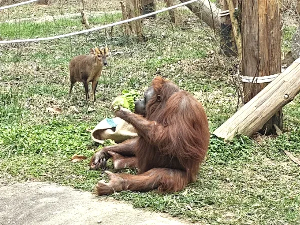 偶尔,当猩猩们在攀爬树木时折断或丢下的高枝掉落下来,这些枝条便成了小麂们的意外“空中外卖”。有时候还会有蔬果掉落噢~