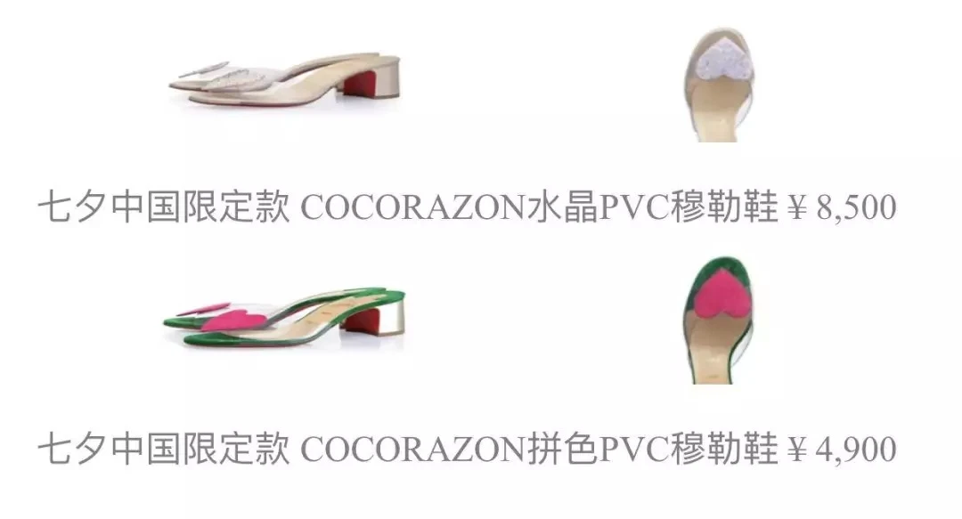 七夕期间,Christian Louboutin 还推出了熠熠闪耀的七夕新款。依旧经典的红底鞋,搭配的是极具夏日清凉的透明 PVC 材质,还有七夕色彩浓郁的爱心嵌于其上。而拥有瞩目色彩的 COCORAZON 拼色 PVC 穆勒鞋,运用翠绿与桃红的色彩碰撞,传承了 CL 的惊艳瞩目气质。