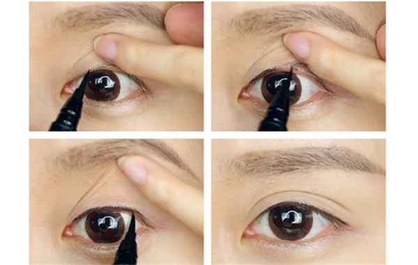 内眼线轻抬起眼皮,找准睫毛根部以及内眼睑的位置,用眼线笔或眼线膏点涂在内眼睑位置。