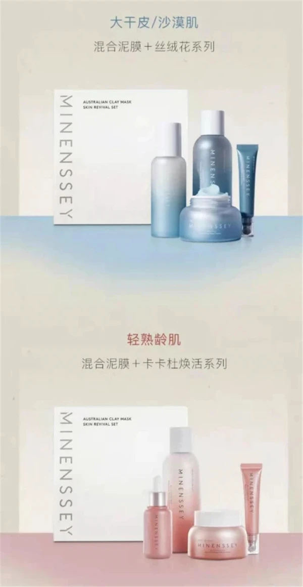 Minenssey蔓索泥膜四色四效,白泥面膜主打补水、粉泥面膜主打抗老、黑泥面膜主打提亮、绿泥面膜主打清洁,能够综合满足多种肌肤护理需求。还有N+1种搭配方式,满足不同肤质、不同场景的肌肤需求。日常混合肌肤T区油两颊干,就选绿泥+白泥组合;熬夜T区暗黄,U区衰老倦容难掩,就选黑泥+粉泥组合;晒后T区泛红出油更旺盛,U区黑色素容易沉淀,导致肤色暗沉无光泽,就选绿泥+黑泥组合。更多肌肤问题都可以选择适合的彩泥随心搭配。