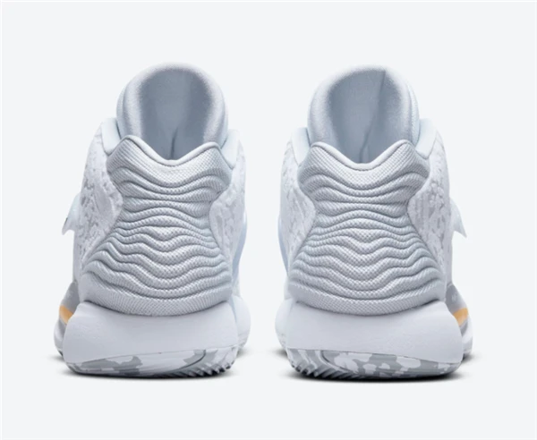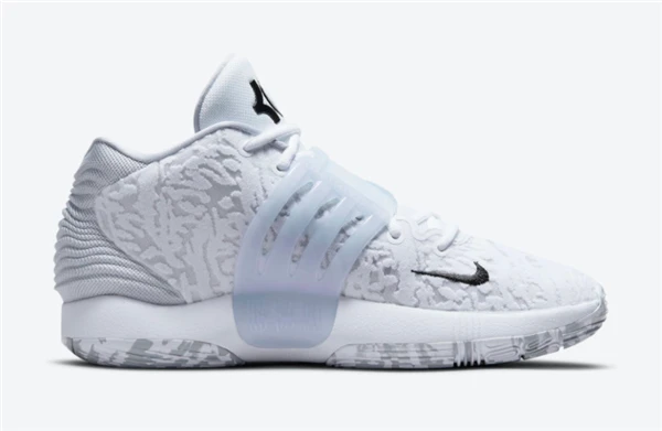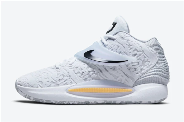 这款被称为“家”的配色在鞋帮的整个鞋面上均采用白色多层网眼结构,鞋舌上的KD品牌,中脚绑带上的Swooshes,内侧脚趾上的迷你Swooshes则选用黑色装饰。半透明的中脚带子,中底的全长Zoom Air缓冲以及大理石纹橡胶外底使这款Nike KD 14的外观更加完美。