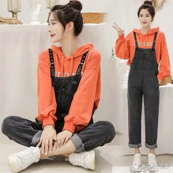 你好! 蓝色背带裤适合搭配灰色连帽卫衣!