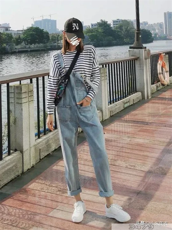 牛仔背带裤搭配黑白条纹T,非常有春天的感觉,搭配平底鞋或运动鞋都别有风范