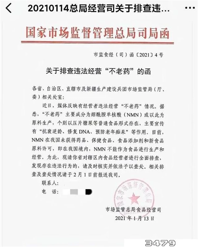 好景不长,在2021年1月13日,国家市场监督管理总局印发的《关于排查违法经营“不老药”的函》流出,函件内说明,要求各省排查有无违法经营“nmn不老药”的情况,并且在该函中明确指出,“在我国境内,nmn不能作为食品进行生产和经营。”
