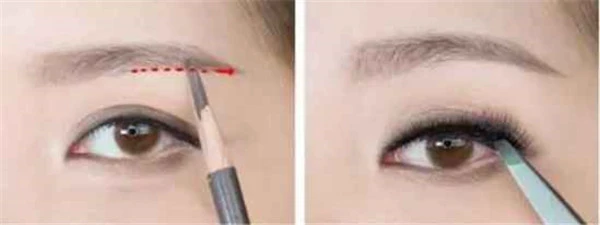 Step7:用棕色眉笔勾画眉形,平眉会加强女王气场。贴上假睫毛,刷上睫毛膏。
