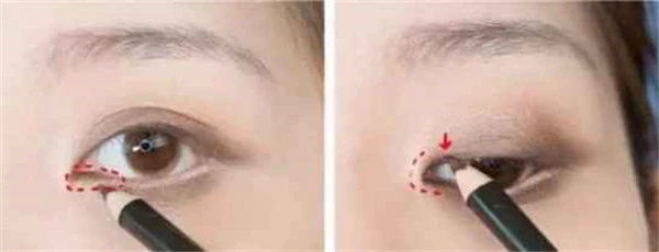Step2:在内眼角的上方扫上少量的白色珠光眼影,然后用白色眼线笔在下眼角的尾部,外眼角的下方画上一段白色内眼线,放大双眼。