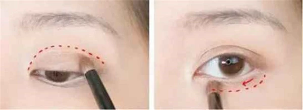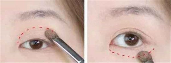 Step3:在上眼睑(图片红色区域内)涂抹上咖色眼影。在下眼睑也涂抹上同样的咖色眼影,涂抹时从外眼角往内眼角涂抹。